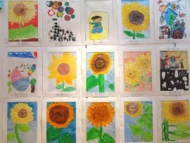 小学1年生のはじめての出展作品は、真っ赤な消防車、小学2年生は個性的なひまわりが並び、小学3年生は樹木を写生した。高学年になり4年生はスポーツをする人などテーマは自由で、小学5年生は建物を写生した。6年生も自由なテーマで描かれている。