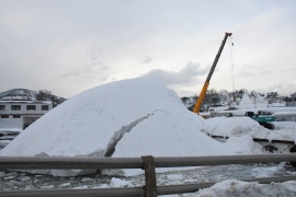 雪を捨てる海上部分に、沢山の雪が運びこまれたため、融けるはずの雪が融けずに巨大な雪山が左右にできていた。