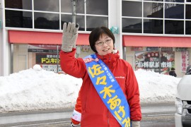 日本共産党佐々木明美氏は、公示日は倶知安町の同地方合同庁舎前で第一声を済ませ、13:00に長崎屋小樽支店前に姿を表し、支持者が見守る中、街頭演説が行われ、高市首相がなぜこんな寒い時期に総選挙をするのか、自分が総理で良いか真意を問う選挙と言っているが、総理大臣を決めるのは選挙ではなく国会と批判し、高市政権に厳しい審判を下す選挙にしたいと述べた。