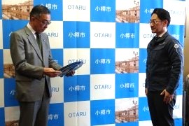 2月6日(金)11:00より市役所(花園2)2階市長応接室で、同助成事業の指定書(表彰楯)交付式を行い、同社・津司直人代表取締役と同社・濱田亜紀子取締役経理部長が出席した。