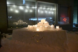企画・主導した渡辺美月さん(小樽支店お客様サービスグループ) は、「皆さまに安心をお届けする責務を担う弊社が、 雪あかりの路においても道行く人に安心をお届けできればとの想い からテーマに。そのため、 オブジェクトは安定感のある土台にひし形を重ねる左右対称のデザ インにしました。ろうそくのあたたかな光に加え、 道行く方が見かけてほっと一息つけるような空間にしたいと考え、 社屋を飾るイルミネーションも暖色で統一しております。 地域の皆さまが、当社から”安心” を想起していただけますように。これからも地域の一員として皆さ まとのつながりを大切にしていきたいです。」と、 あかりの市民会場の思いを述べた。