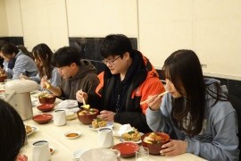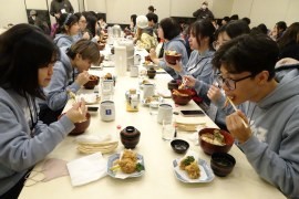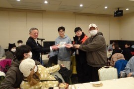 昼食会は、2月10日(火)に開かれ、海外ボランティアの韓国のOKOBOと台湾のyooohao、日本人ボランティアチームみかん7名を含む合計90名が小樽の老舗政寿司さんに招待され、11:00~と12:30~の2回に分けて、同店3階の大広間で、同店からの好意も加わり、海鮮丼または天丼、唐揚げ、吸物が振舞われた。