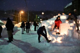 小樽水産加工業協同組合(手宮1)の前広場で、 建国記念日の2月11日(水・祝)20:00まで恒例の1日限りの雪あかりの路が開催された。