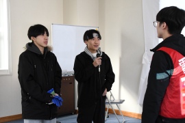 西岡・原田両副実行委員長の挨拶に続き、センサーグローブの正しい装着方法の説明やルール説明では、雪かき10分でセンサーグローブを作動させ、活動量計を参加者全員に時間内で回して測定する。その後、整地20分では、雪かきをした場所を地域住民が歩きやすいように整地する。スコップ以外では雪を運ばないよう注意した。