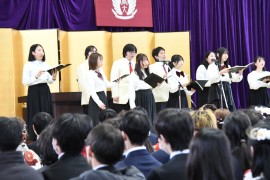 グリー&カンタール10名が校歌と応援歌の若人逍遥の歌を斉唱し、卒業生は思い出深い学び舎と別れを告げた。