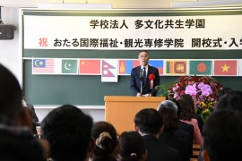 開校式の中で、和田健夫理事長は、「開学の精神は、小樽の地で、多文化共生社会をつくること。多国籍の学生が一緒に学び合う環境のもと、文化、言語、考え方をお互いに理解し、専門的技術を身に付けて小樽で仕事をし、共に社会を支える人材を育成する事が目標。新しい学校が良い教育をして、学校の評価を高め、いろいろな国から来てもらうのが私の願望」と、挨拶した。