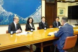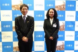 JICA海外協力隊の本年4月から東ティモールに派遣予定の鈴木美海さん(26)と、同隊員としてエクアドル共和国で2年間の活動を終えて帰国した佐藤剛さん(55)は、4月7日(火)15:00から市役所(花園2)2階市長応接室で、迫俊哉小樽市長を表敬訪問した。