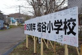 看板が気になっていた余市在住の相澤さんは、1986(昭和61)年3月の卒業生で新しい体育館が完成しそこで卒業式を行った思い出もあり、1クラス35人で学年4クラスあり640人以上の児童がいたといい、「看板が設置されてから車で通る度に気になり、絶対、見ようと思い来てみた。みなさんのメッセージを読むと感慨深く、胸が熱くなる。塩谷が大好きで学校も校歌も好きで覚えている」と、話した。