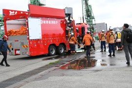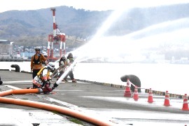 小樽市消防本部(入井直樹消防長)は、4月28日(火)10:00から勝納ふ頭1番バース(築港5)で総務省消防庁から、昨年12月に無償で配備された道内唯一の海水利用型消防水利システムの操作研修会を実施した。