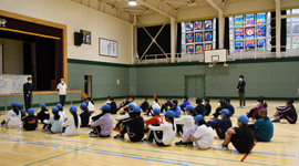各校20名ずつ40名が2クラスに分かれ、同校教諭の指導の下、中学校の生活や学習についてや、音楽と体育の授業を受け、体育の授業では、体育館でランニングや体操、マット運動に取り組んだ。