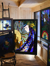 店内には、吉岡さんの父・正晴さんが制作したモダンなステンドグラスの作品12点を展示するギャラリーがある。上品なデザインの作品が並び、ステンドグラスを施した写真立てやアクセサリー、ランプも展示販売し、来店客の目を楽しませている。
