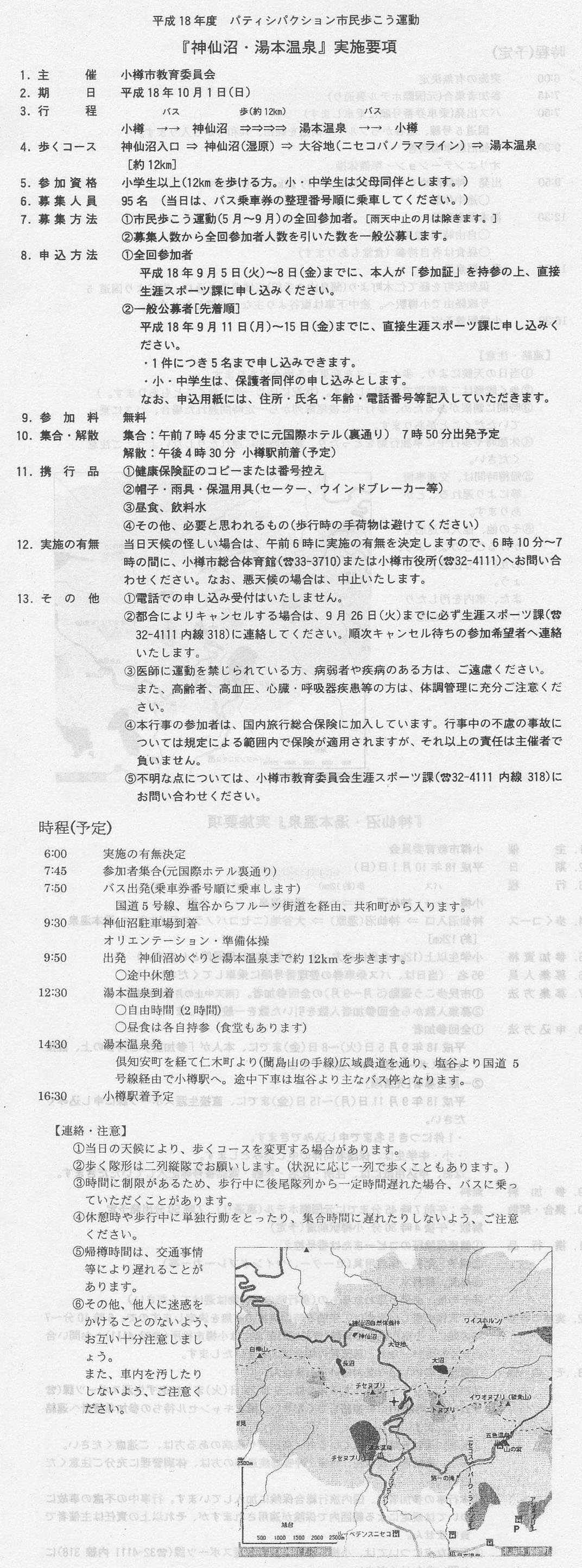 10月1日(日)旧国際ホテル裏通りを集合場所とし、バスで神仙沼まで移動。湯本温泉までの約12kmを歩く、市民歩こう運動「神仙沼〜湯本温泉」を、先着95名(小中学生は保護者同伴)を対象に開催。参加無料、保険料100円。申込は、5月〜9月の歩こう運動全てに参加した方は、参加証を持参し9月5日(火)〜8日(金)、一般の方(連名は5名まで)は9月11日(月)〜15日(金)に、いずれも直接生涯スポーツ課(花園5-10-1・教育委員会庁舎内)へ。問合せ