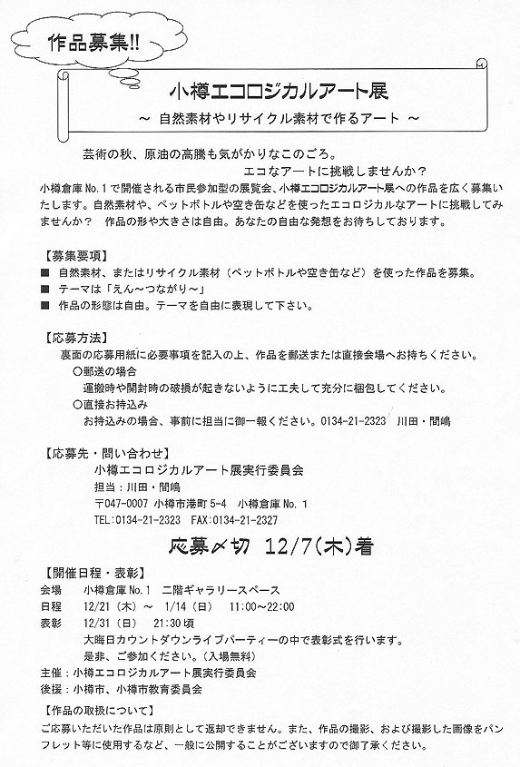 小樽倉庫No.1(港町5-4)2階ギャラリースペースで、市民参加型の自然素材やリサイクル素材を使ったアート作品を展示した、小樽エコロジカルアート展を12月21日(木)〜平成19年1月14日(日)11:00〜22:00の期間で開催。テーマは「えん〜つながり〜」で、参加作品を12月7日(木・必着)まで募集。郵送、持込みは自由。応募先:小樽エコジカルアート展実行委員会(〒047-0007