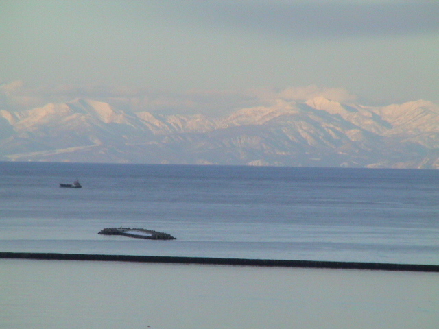 小樽港から石狩湾をまたぐ、対岸の増毛連山の白い峰々が青い海に浮かび、くっきりと見事な自然の造形を見せた。厚い雪に覆われた増毛の山には、春はまだまだ遠い風情だ。