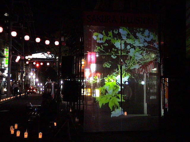 は、歩道の上に組み立てた大型スクリーンに、DVDで撮った映像をパソコンを使って映写する。すでに葉桜となっている夜の花銀通リに、音と映像により、桜の花が咲いた。