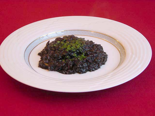 スペイン産のいか墨とニンニク・玉ネギ・トマト・白ワインに、真イカを入れ煮込んだリゾットは、米の固さ加減も良く、食べる人を満足させる一品だ。