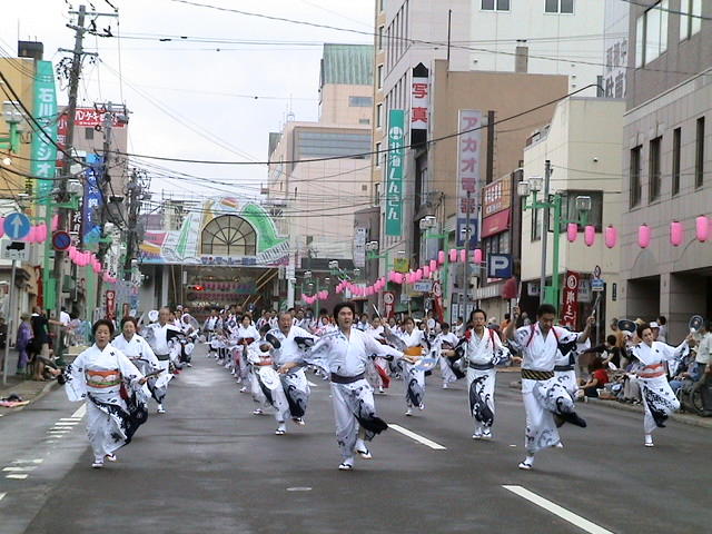 天候も良かったが蒸し暑く、浴衣姿の踊り手は汗だくでの行進となった。各梯団は、浴衣や踊りにそれぞれ工夫を凝らし、三波春夫の「潮音頭」のドンドコザブーン・ドンザブーンに合わせていた。