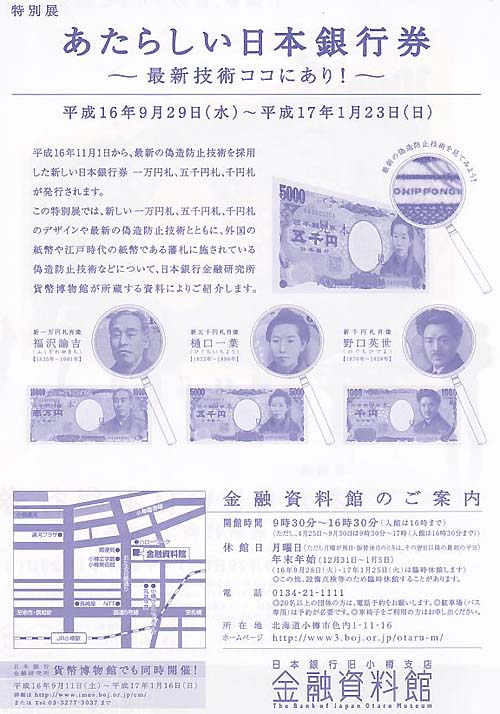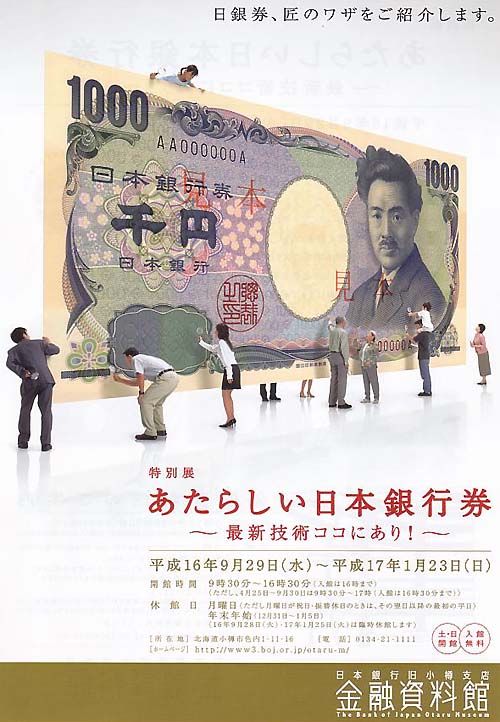 金融資料館の特別展「あたらしい日本銀行券〜最新技術ココにあり」! 日本銀行旧小樽支店「金融資料館」(色内1)では、第1回特別展「あたらしい日本銀行券〜最新技術ココにあり」を、9月29日(水)から開催する。 同特別展は、11月1日から発行される新しい日本銀行券の一万円札、五千円札、千円札の最新の偽造防止技術を紹介する。 この日銀券の匠の技の紹介は、東京の日銀金融研究所貨幣博物館との同時開催。小樽に居ながら、日銀券の高度な偽造防止技術の数々を見ることが出来る。 特別展開催は、2004年9月29日(水)から2005年1月23日(日)。開館時間9:30〜16:30、月曜日休。 |