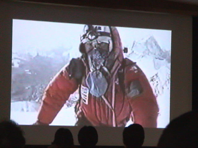初めに、登頂の模様を映した12分間のビデオを紹介した。ビデオには、立ちはだかる氷の壁、牙を剥いたクレパスに渡されたハシゴ、一歩一歩の歩み、頂上アタックの様子、ついに登頂成功の様子が映されている。 「人は幾つになっても夢を持つこと。その夢の実現に向かって努力し続けること。さらに困難や危険を承知の上で諦めない。一歩ずつ小さな一歩ずつの積み重ねが、いつか世界一の頂上に立てるのだと教えてくれた」と、2003年5月22日、70歳222日で、次男豪太さんとの親子同時登頂の様子を、時にはユーモア溢れる穏やかな口調で語り、満席の参加者の耳目を奪っていた。