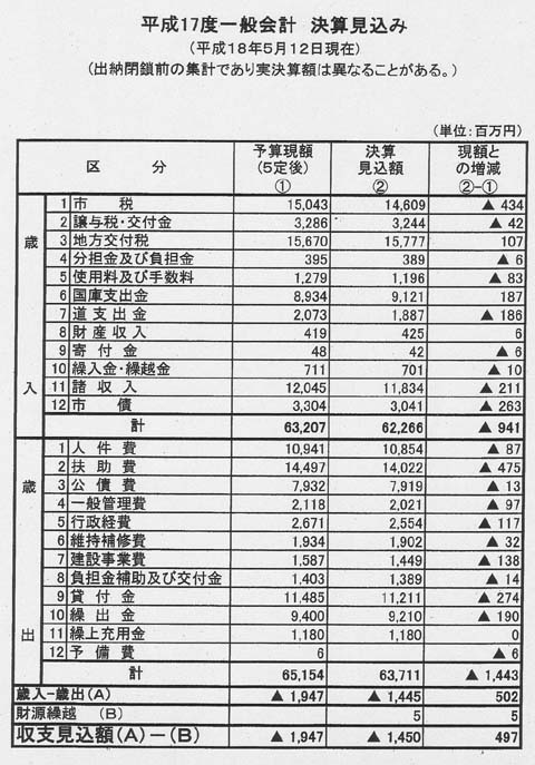 しかし、市有地売却で2億7,520万円の収入があったが、今冬の大雪での除雪費の2回の追加補正が4億6,000万円と膨らみ、地方交付税、減額補正での歳入減もあり、2006(平成18)年3月では、赤字額は19億5,000万円となっており、20億円を超すのではないかと思っていたが、歳入増もあり、歳出不要額も出て、3月より現在までで5億円を圧縮できたが、2005(平成17)年度の累積赤字額は14億5,000万円の見込みとなった。