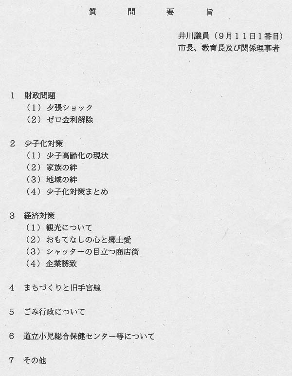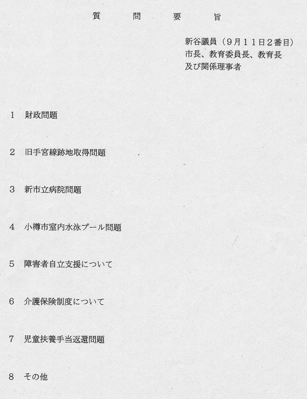 民主市民連合の山口保議員は、新市立病院について、中心商店街の再生と旧マイカルの抜本的整理との関連で質問。「旧マイカルには、広大な床が空いている。団塊世代も定年を迎えるので、ここに人間ドックなどを売り込むのを考えても良い。旧ビブレ棟で昭和学園のタカガワグループが運営されればと考える。市民フォーラムでは、多くの市民が集まり、関心も高かったが、なお、議論の余地が残されているので、新病院では一層慎重な対応を望む」と質問。山田市長は「旧マイカルの施設使用は、基本的には、OBC(小樽ベイシティ開発)が決める問題で新体制が発足したので、新たな計画が示されれば協力したい。タカガワグループ会長とは、いずれ近いうちに話をしたい」と答弁した。