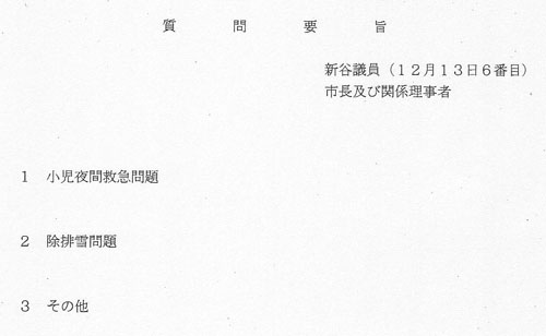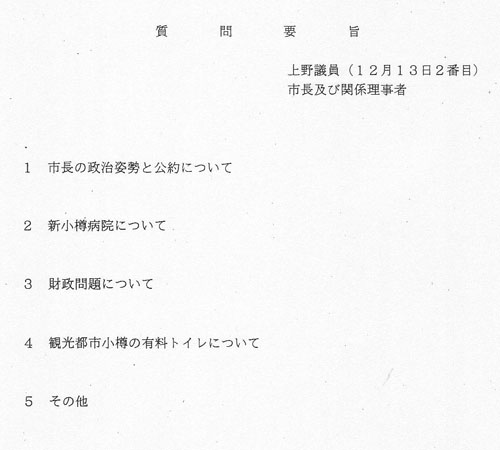 小樽市議会12月定例会、7議員が一般質問!(2006/12/13) 一般質問に立ったのは、民主市民連合・山口保、平成会・上野正之、森井秀明、共産党・菊池葉子、新谷とし、自民党・佐々木茂、公明党・秋山京子の7議員。